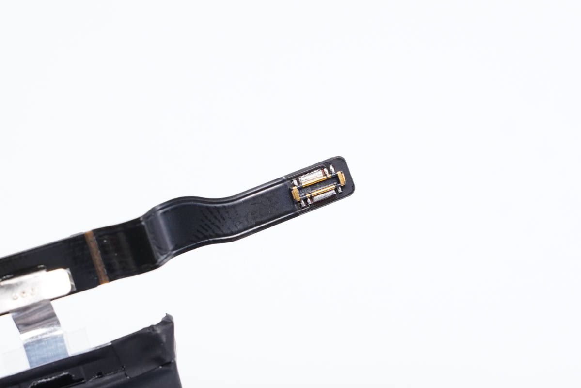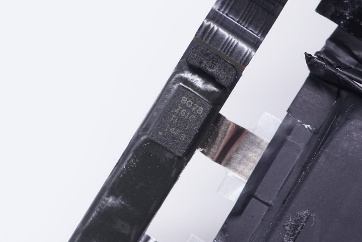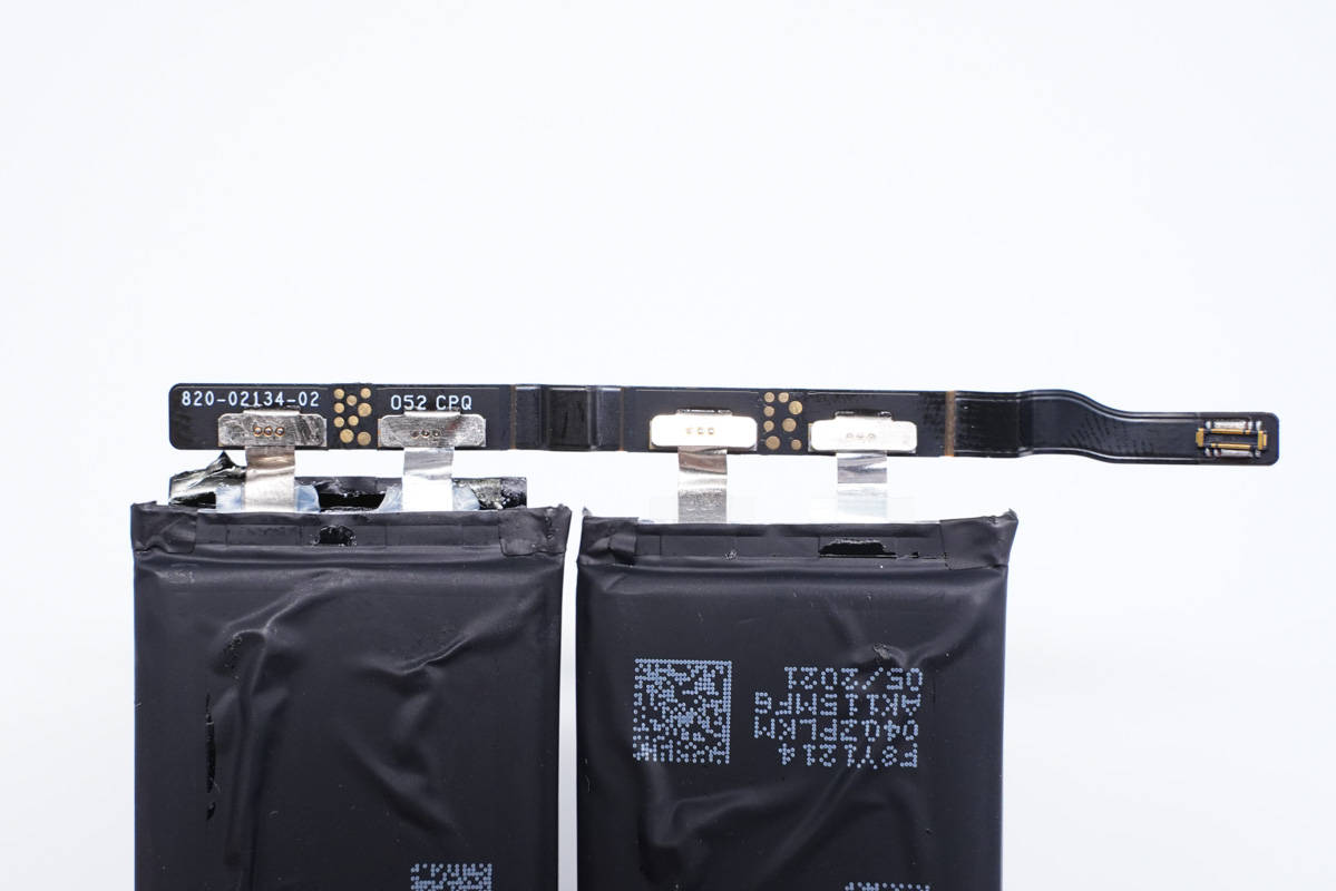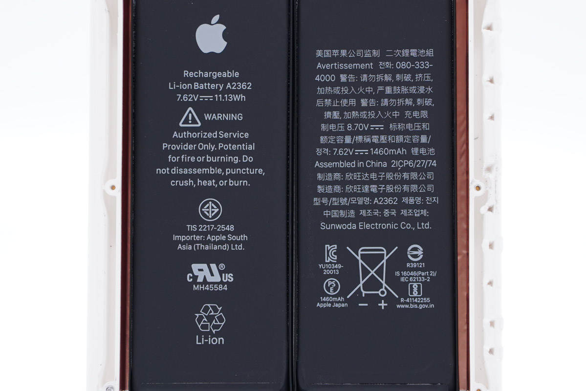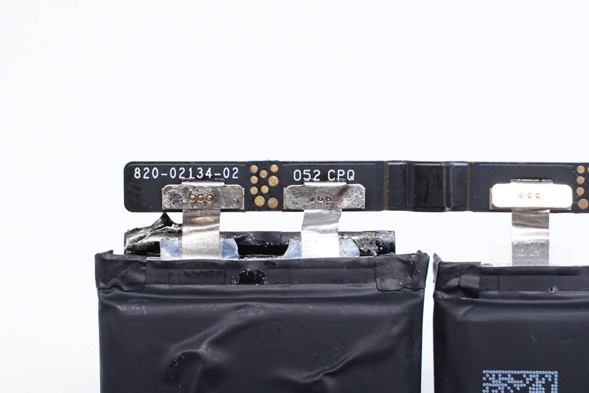 二串電池組特寫,型號A2362,由兩塊均壓3.81V,充電限制電壓4.35V,容量1460mAh的電芯串聯,組成7.62V 11.13Wh的電池組,由欣旺達代工。