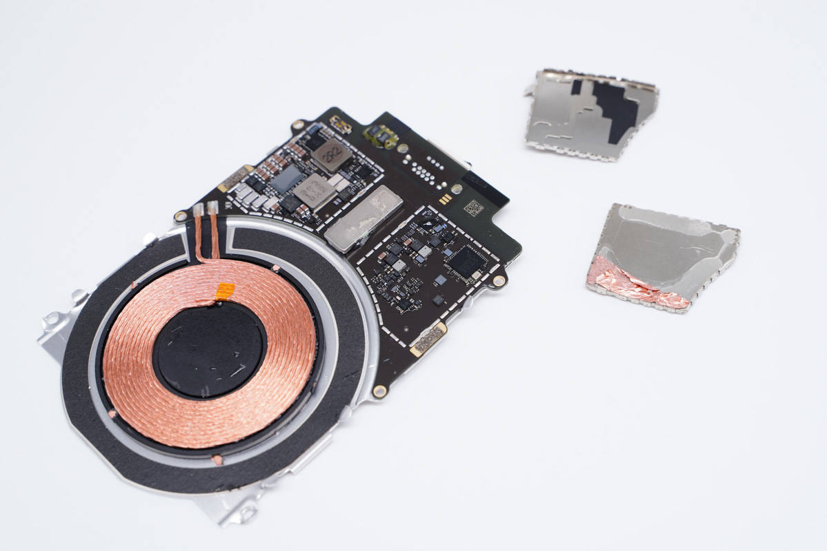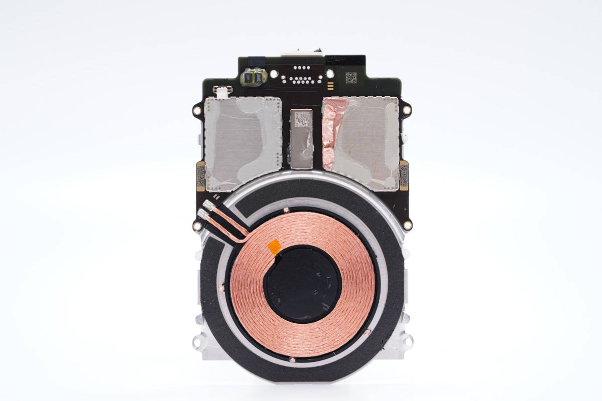 擰開周邊六顆固定螺絲,取下無線充電線圈和電路板,下面是二串電池。