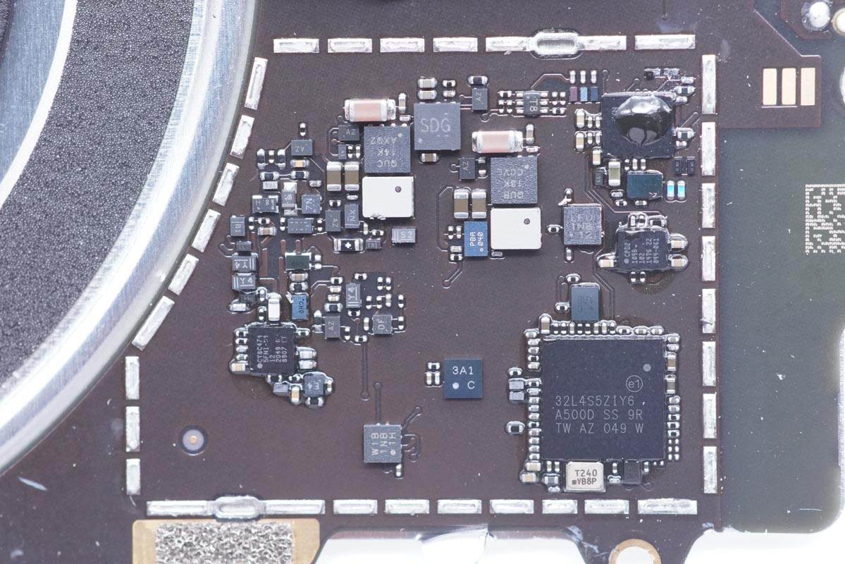 電路板上面有兩個屏蔽罩,中間是定位磁體。