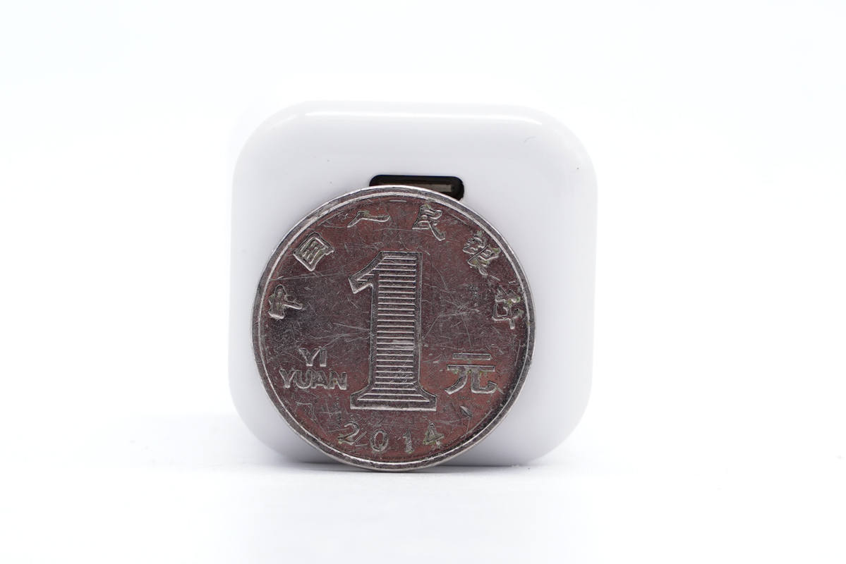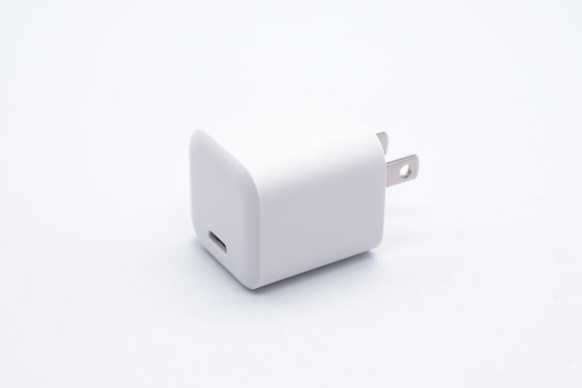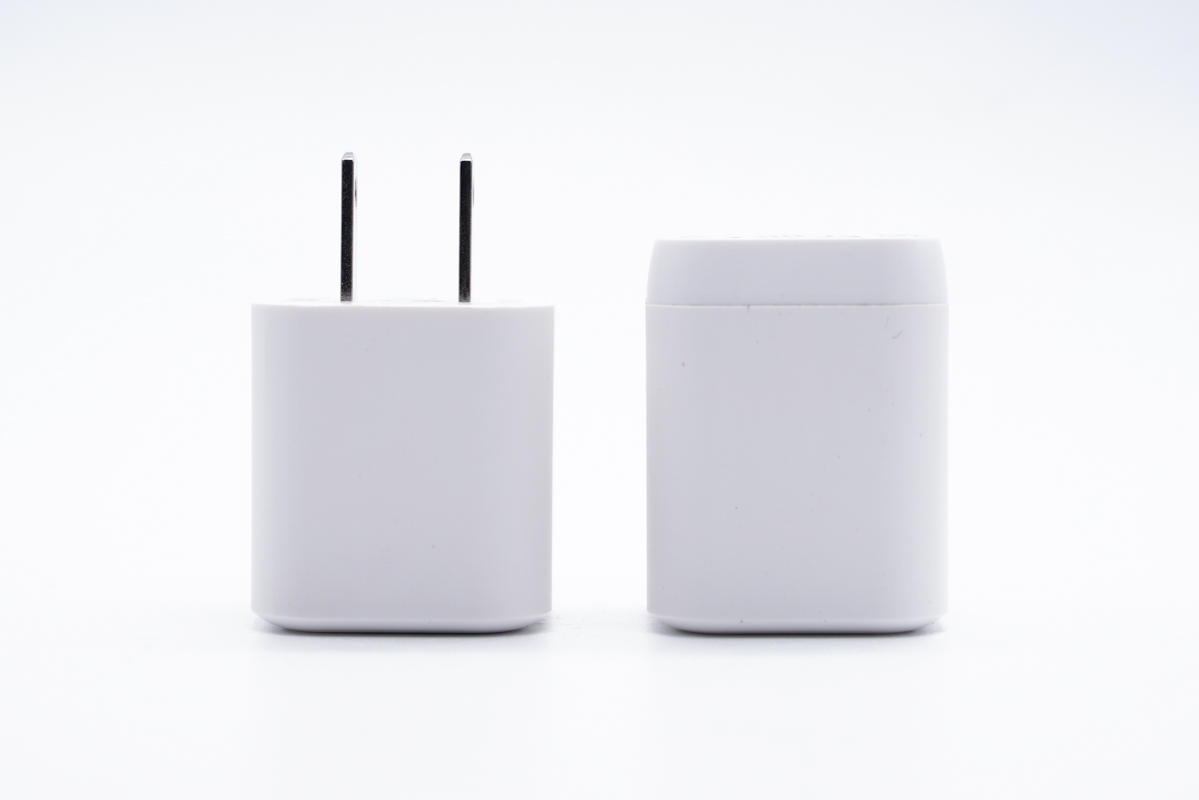 充電器采用小方塊造型設計,PC阻燃材質白色外殼,腰身拉絲工藝處理,頂面高光亮面,整體外觀十分簡潔。