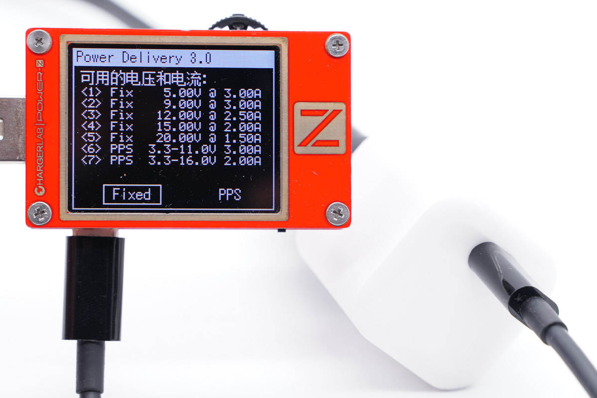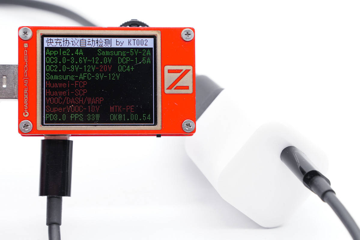 使用ChargerLAB POWER-Z KT002檢測USB-C口輸出協議,顯示支持Apple 2.4A、Samsung 5V2A、DCP協議,以及QC2.0/3.0、AFC、PD3.0、PPS快充協議。