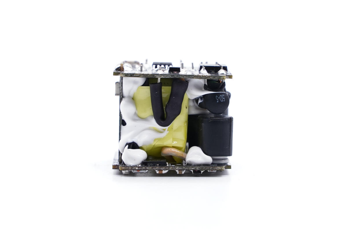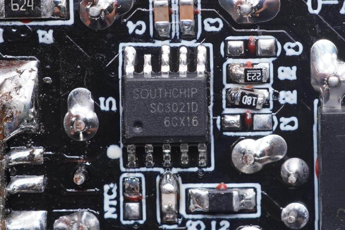 充電頭網通過拆解了解到,充電器采用三塊電路板組合焊接,U型結構設計,為了提高整體穩定性,元器件間的縫隙填充硅膠,另外濾波電容外套塑料殼絕緣,輸出端小板鏤空避免積熱。充電器采用南芯半導體SC3021C+SC3503+SC2151A全套高頻QR氮化鎵快充方案,搭配英諾賽科第二代氮化鎵功率芯片INN650DA04,威兆MOS管同步整流以及輸出保護,綠寶石電容進行輸入輸出濾波,用料可靠。