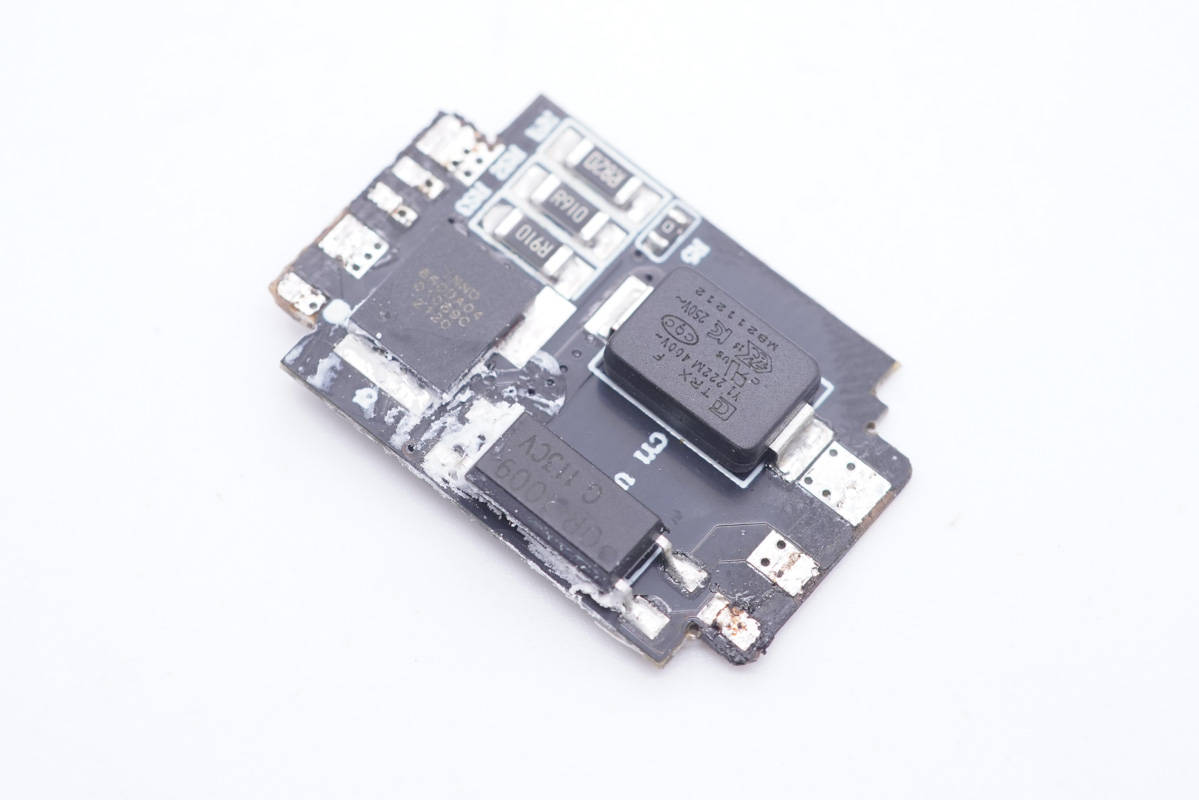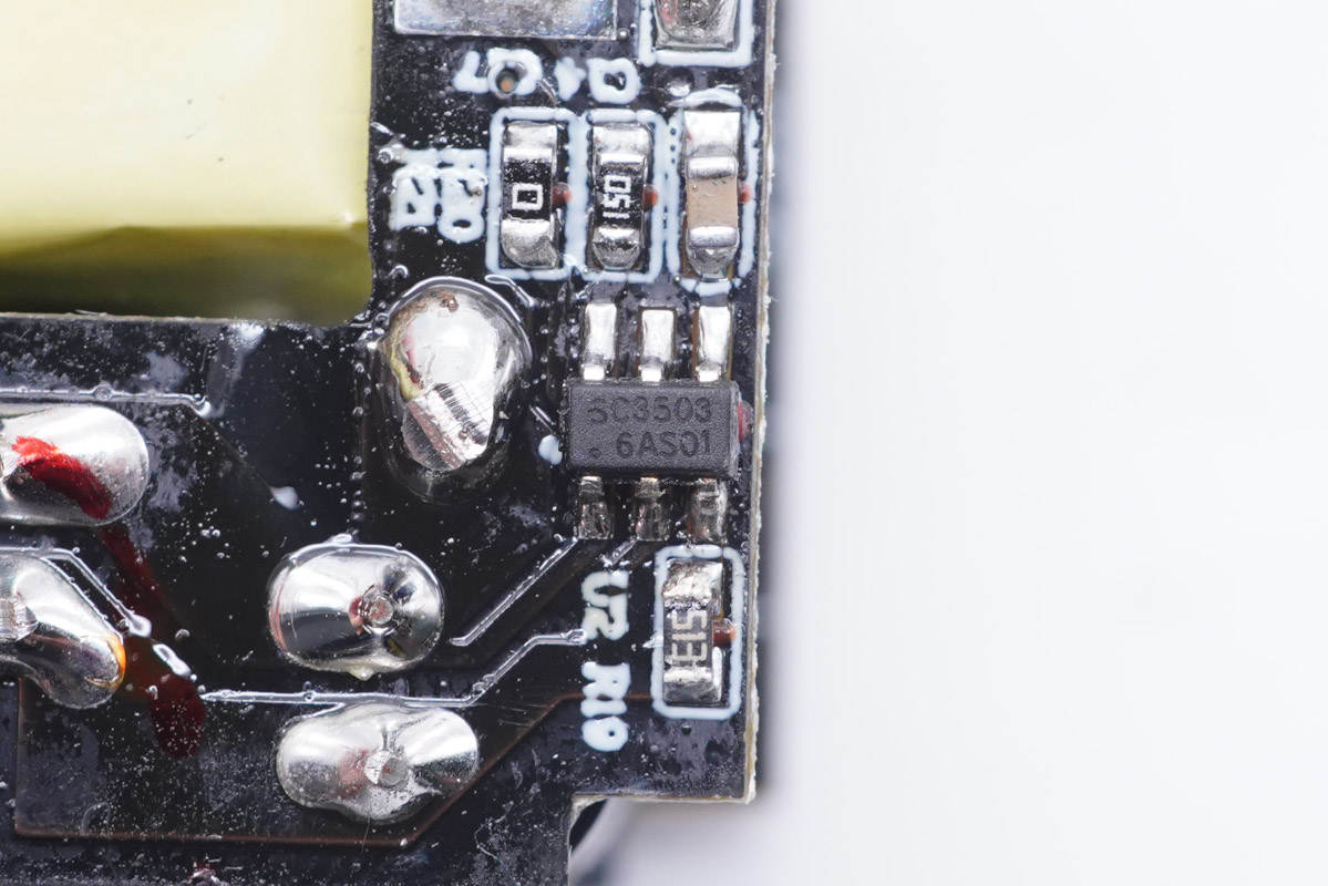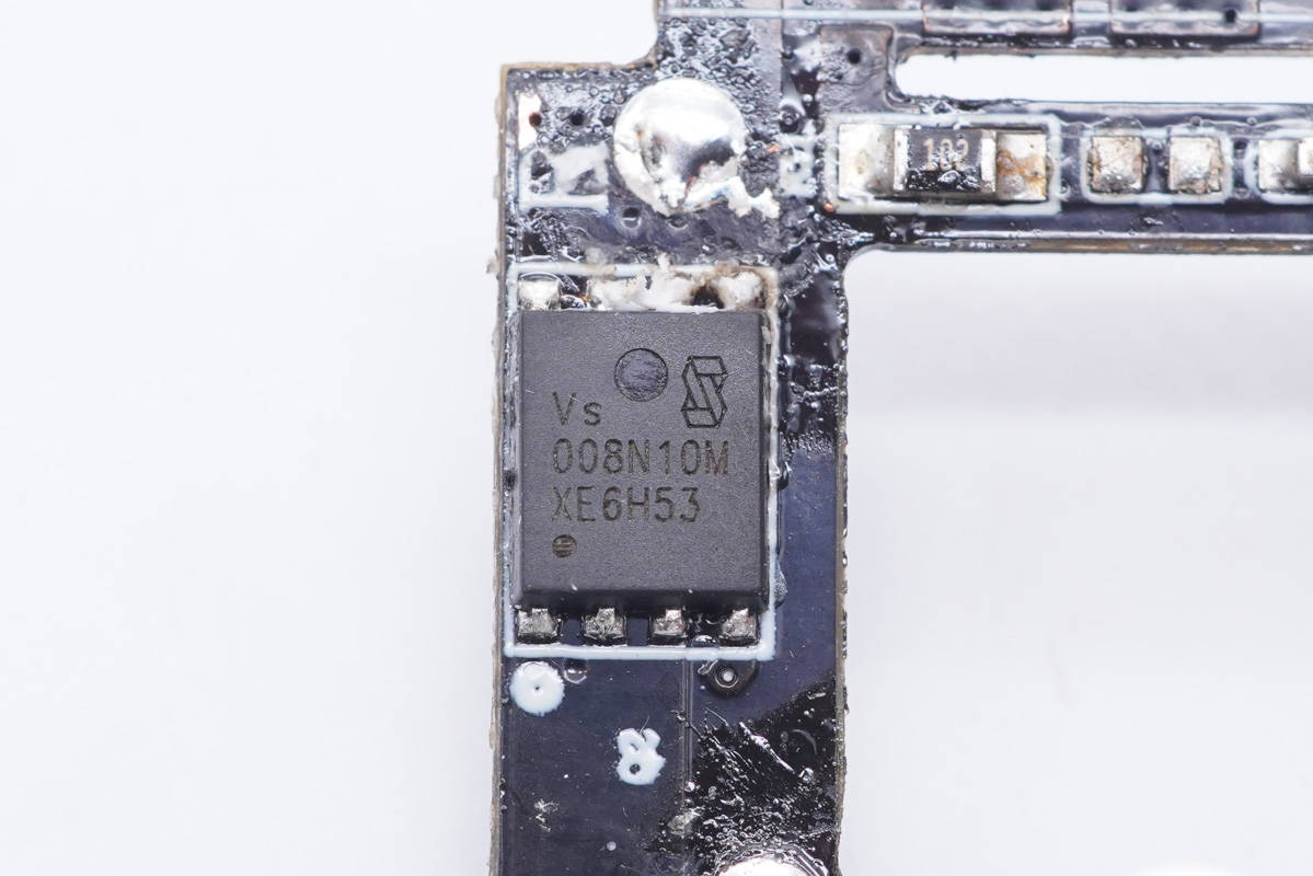 輸出端小板鏤空,避免積熱,這一面設有一顆同步整流控制器。