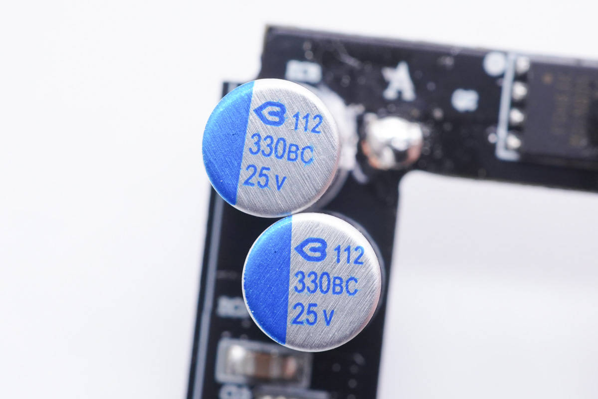 兩顆輸出濾波固態電容也是來自綠寶石,規格為25V 330μF。