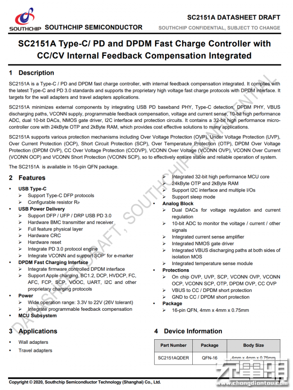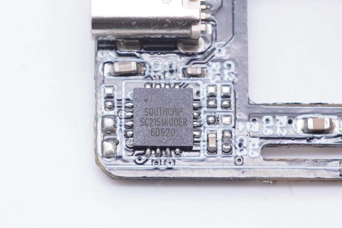 協議芯片同樣來自南芯,型號為SC2151A。該芯片采用16-pin QFN 4*4mm封裝,是一顆支持PD和DP/DM快充協議的控制器,內部集成反饋環路,支持最新的Type-C和PD3.0標準,同時還支持使用DP/DM接口的專有快充協議,適用于各類適配器應用。