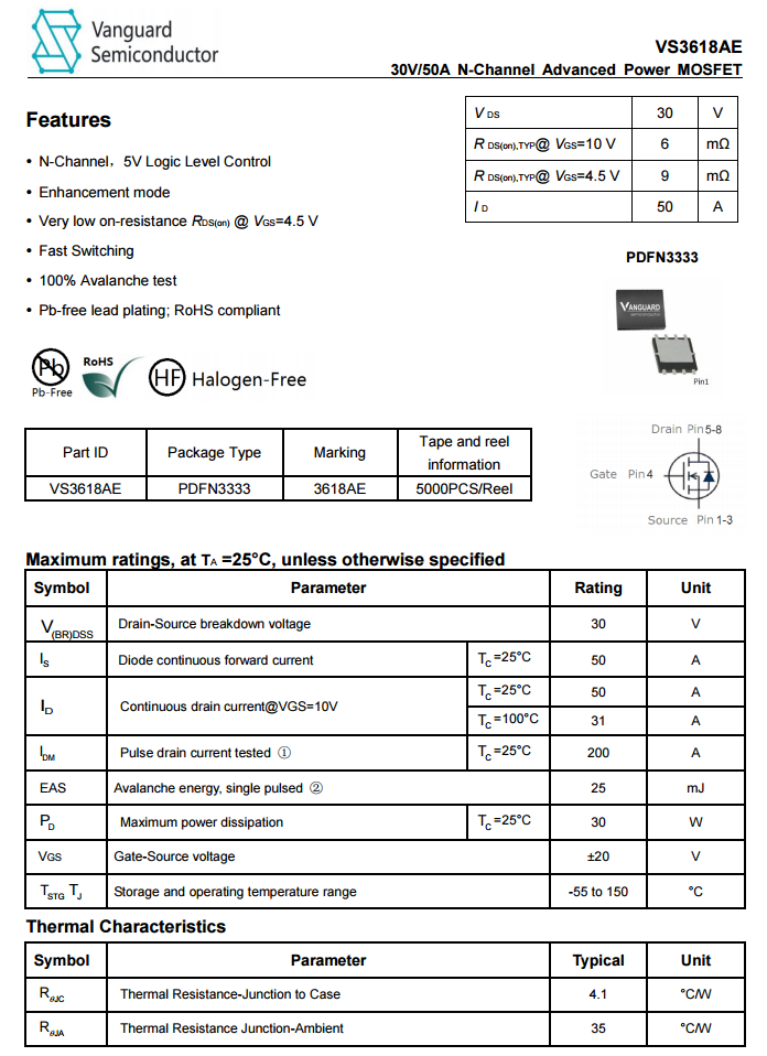 輸出VBUS開關管采用威兆半導體VS3618AE。NMOS,耐壓30V,PDFN3333封裝。