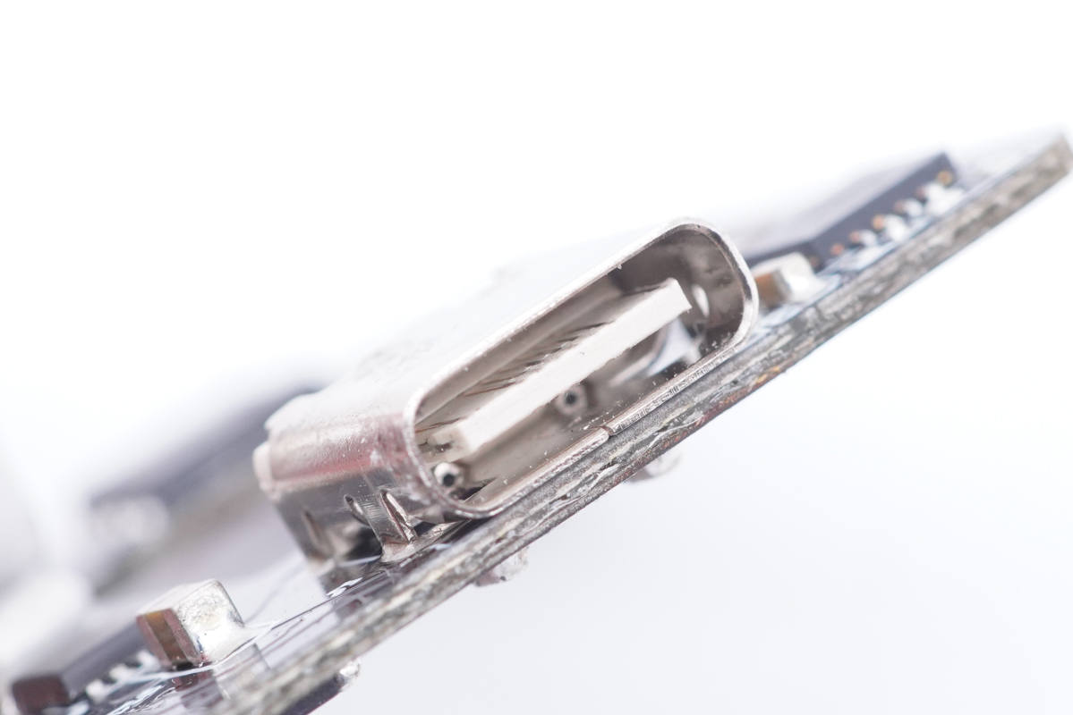 USB-C母座特寫,過孔焊接,白色舌片不露銅,內部夾鋼片經久耐用。