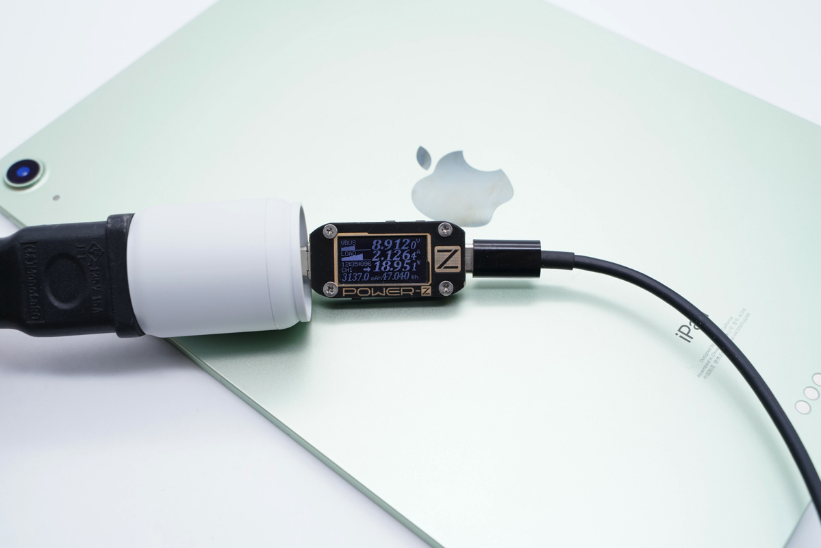 iPad Air 4配備USB-C充電接口并支持USB PD快充,使用充電器為iPad Air 4充電,功率為8.91V 2.12A 18.95W。