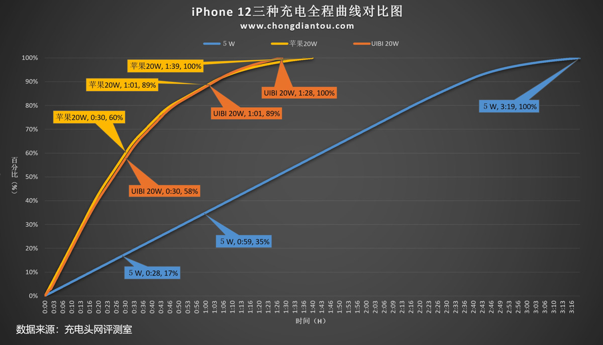 因為UIBI柚比20W迷你小可樂快充充電器針對的是iPhone 12機型,所以此次增設了為iPhone 12充電全程的曲線圖,并將蘋果20W PD充電器和蘋果5W充電器為iPhone 12充電全程的曲線圖加入了進來。