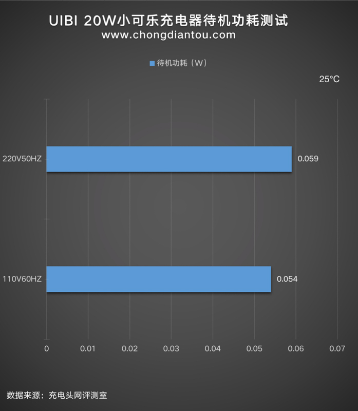 經過功率計測試,UIBI柚比20W小可樂充電器在220V 50Hz的空載功耗為0.059W,換算下來一年損耗的電能約為0.51KW·h,若市價電為0.6元/KW·h,則充電器一年的電費約為0.3元左右。