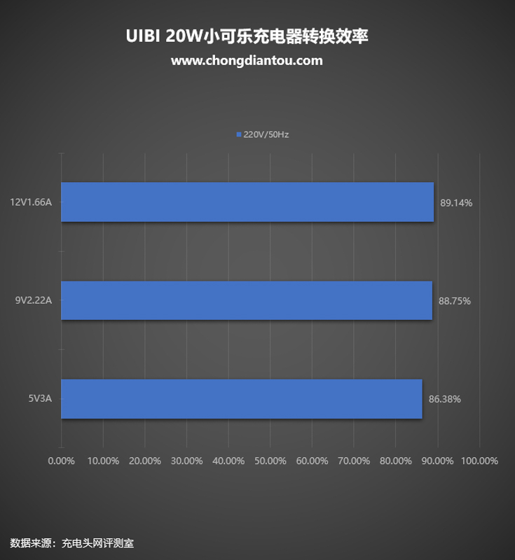 220V 50Hz交流輸入下,將UIBI柚比20W小可樂充電器在各個電壓檔位的輸出功率拉滿進行測試:三個檔位測得插線板AC端輸入功率和USB端輸出功率,通過計算,可得充電器的轉換效率從86.38%到89.14%不等。
