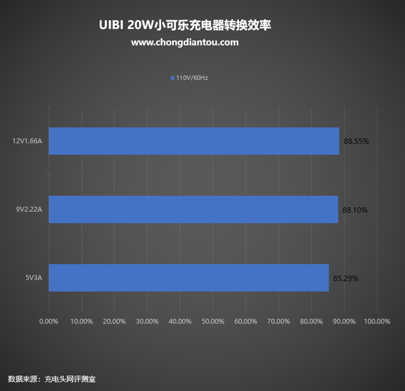 110V 60Hz交流輸入下,充電器的轉換效率從85.29%到88.55%不等。