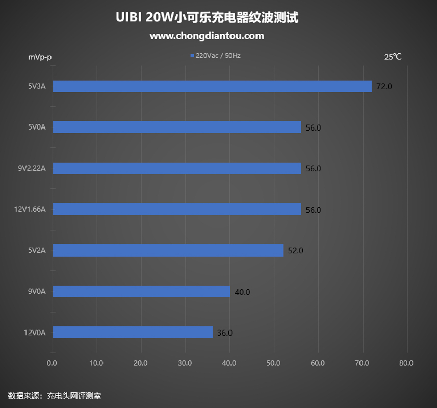 充電器的紋波測試主要分為兩種,分別為空載狀態(柱狀圖中縱軸電流為0A)和重載狀態(柱狀圖中橫軸電流為非0A)兩種狀態。
