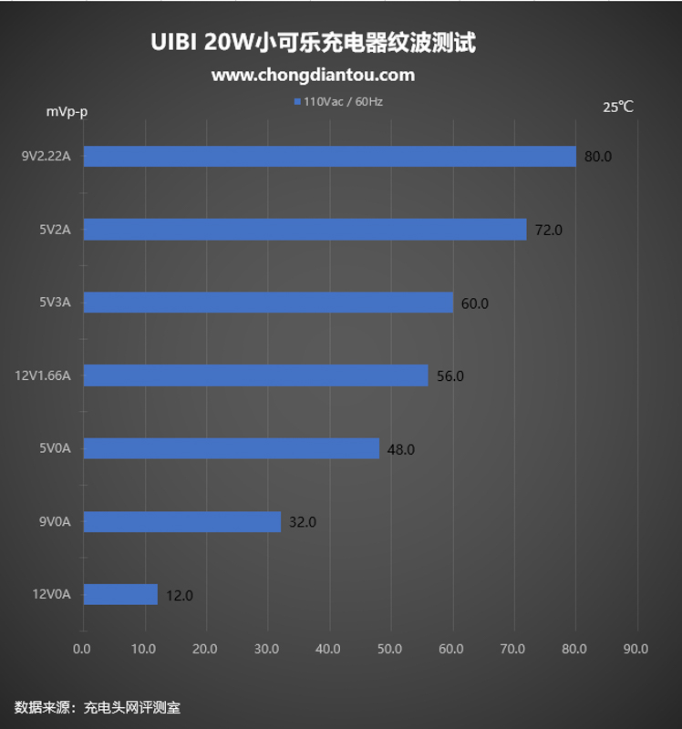 110V 60Hz交流輸入情況下:紋波峰峰值最高為80mVp-p,此時充電器處于9V2.22A工作狀態;最低為12mVp-p,此時充電器處于12V0A空載狀態。