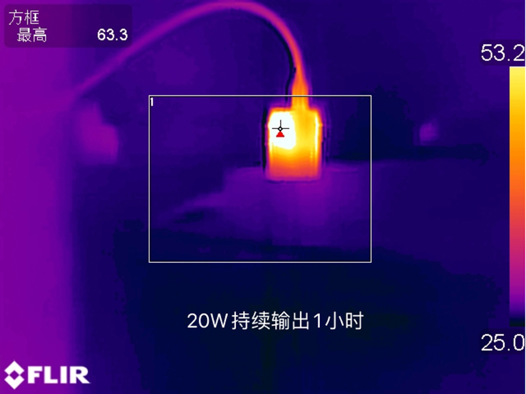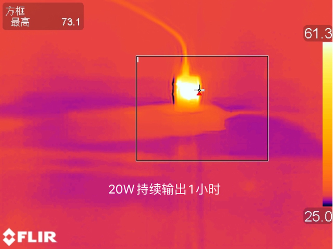 對于溫度的測試此次則是選擇了讓充電器以9V2.22A 20W的功率持續滿載輸出1小時后采集溫度,整個測試依舊是在25℃的恒溫箱內進行的。使用熱成像儀測得充電器表面的最高溫度為73.1℃。