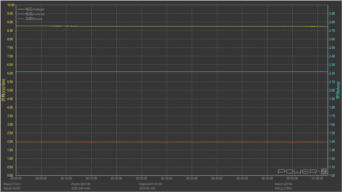 在對充電器的溫度進行測試時也同步測試了充電器的穩定性。按照額定功率9V2.22A 20W滿載對充電器進行穩定性測試,測試時間為一小時,測試過程中電壓值呈水平直線,無明顯波動情況,長時間滿載比較穩定。