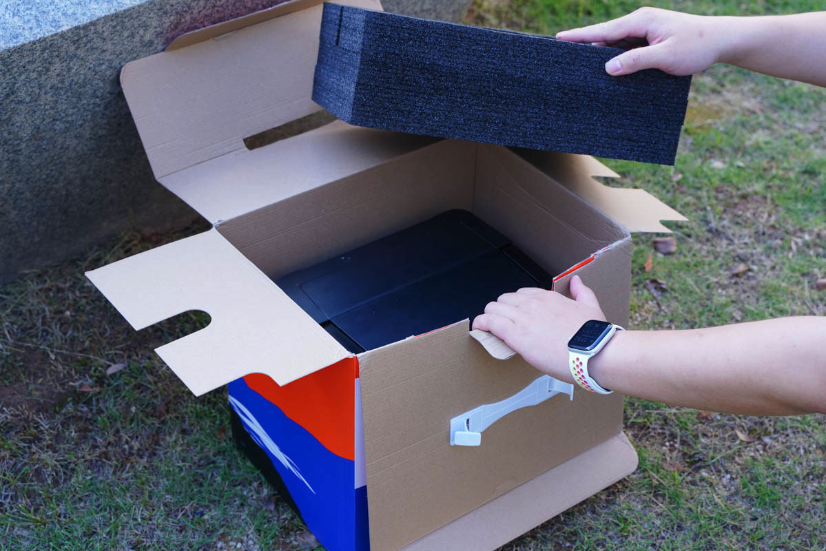 直接打開包裝盒,戶外電源上下均帶有碩大的緩沖泡棉,將戶外電源架空在中間,可以防止暴力運輸損壞產品。