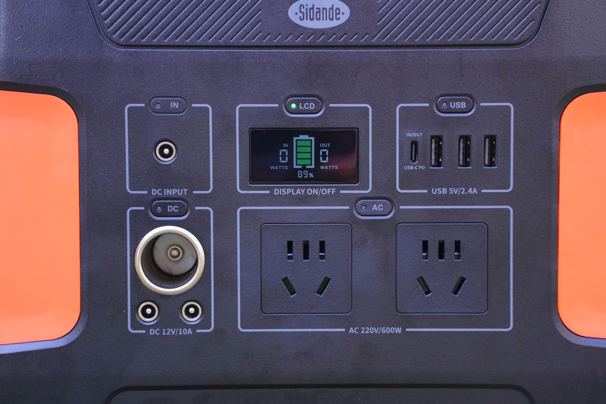 頂部中間位置是自帶的數顯屏,帶有獨立的開關按鍵控制,從數顯屏中可以看到當前戶外電源的剩余電量、自充電的功率以及輸出的功率。