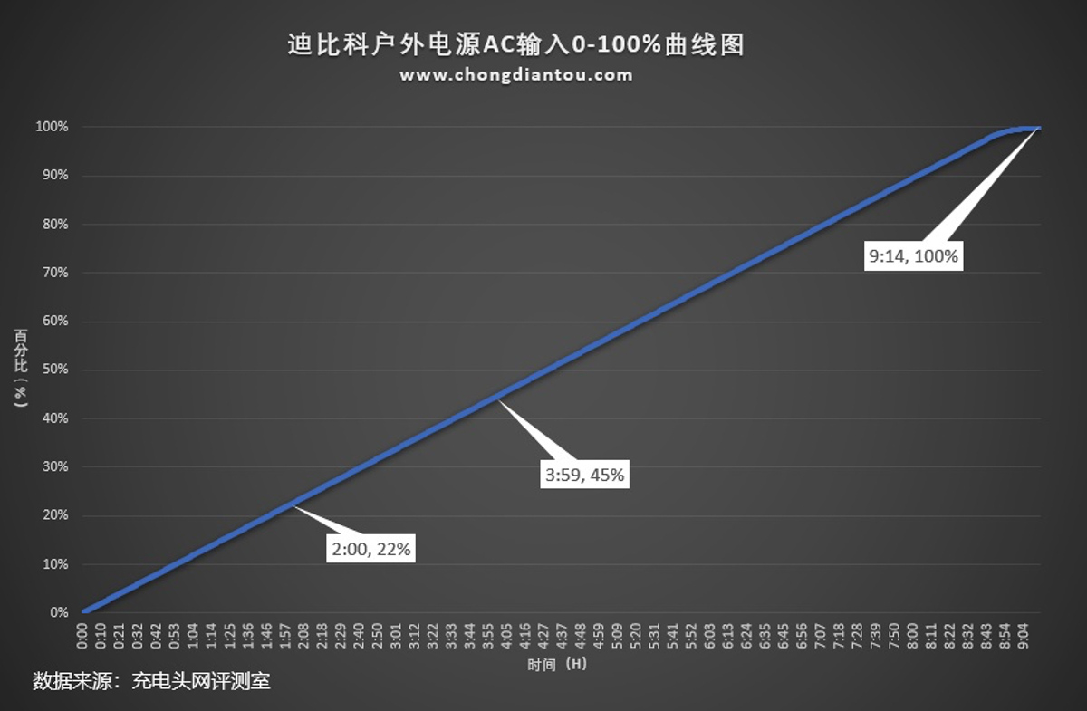 這里通過功率計采集了戶外電源使用自帶充電器通過DC接口輸入的全程,可以看出使用自帶的充電器為戶外電源2小時充電22%,4小時充電45%,完全充滿需要9小時14分。