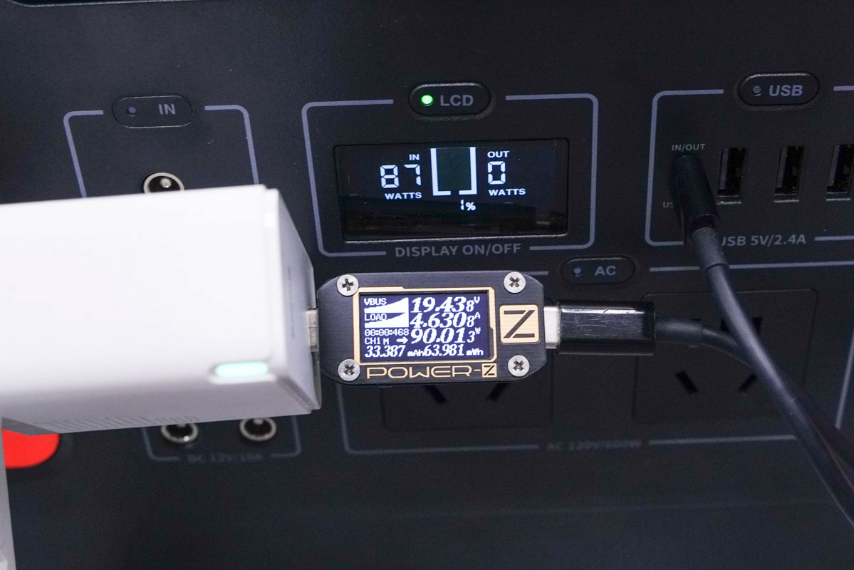 還可以通過USB-C接口為自身充電,同樣可以獲得90W左右的自充功率,這無疑會降低用戶的使用門檻,只要隨便拿一個百瓦的PD充電器就可以為戶外電源充電了。