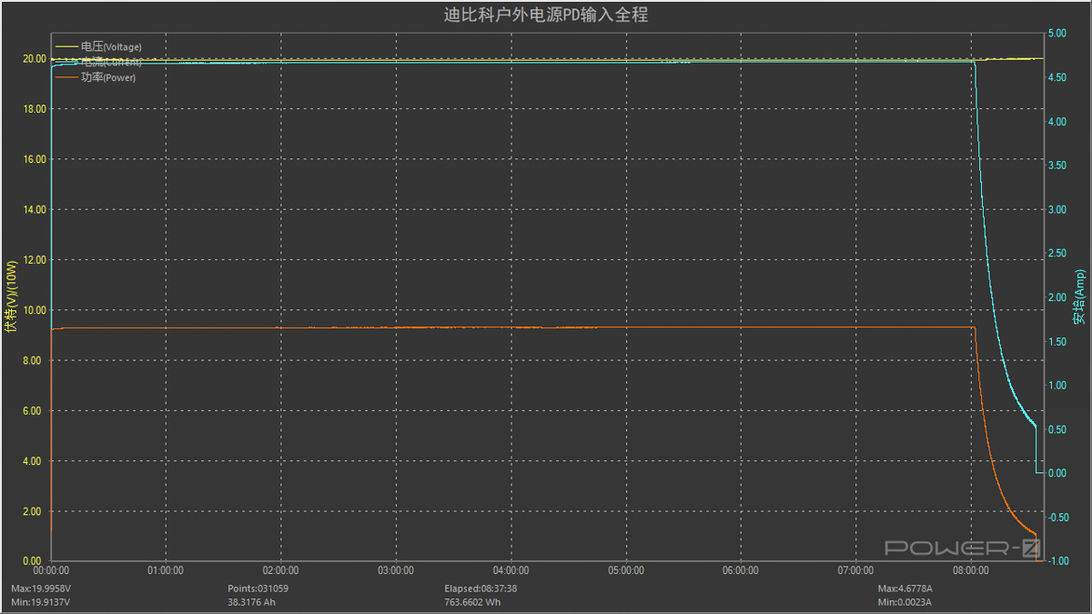 此次還測試了一下使用USB-C自充電的全程,8小時02分前功率處于93W左右的輸入狀態,隨后功率和電流逐漸下降直至充電結束,全程耗時約8小時34分,通過USB-C輸入相較于AC輸入要更快一些。