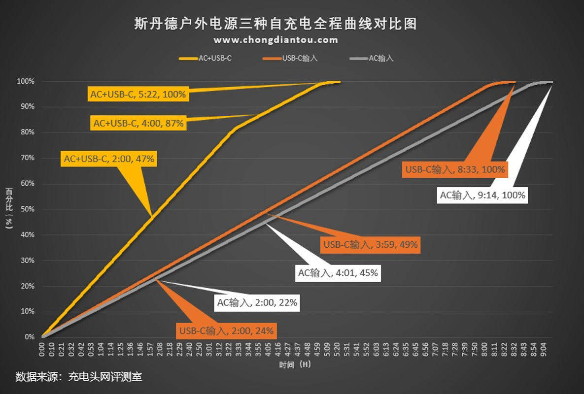 這是斯丹德戶外電源三種自充方式的曲線圖,整體來看USB-C輸入和AC輸入的差距較小,二合一自充電的速度提升很明顯。