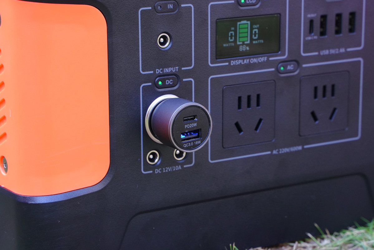 自充方面,附帶三種電源線覆蓋市電、車載充電以及太陽能電池板充電三種自充方式,戶外電源配備DC和USB-C雙輸入接口,并且支持2個接口同時充電。