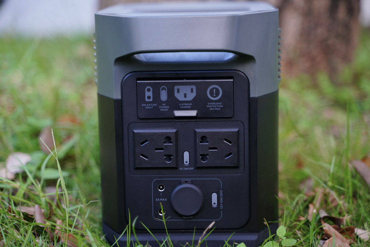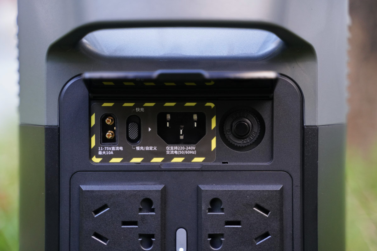 上方是為戶外電源充電的接口部分,帶有保護蓋可以防止異物進入。從左到右分別為大電流太陽能和車充直流輸入接口;快速充電/自定義充電設置切換開關;品字交流電輸入接口以及過載保護開關。