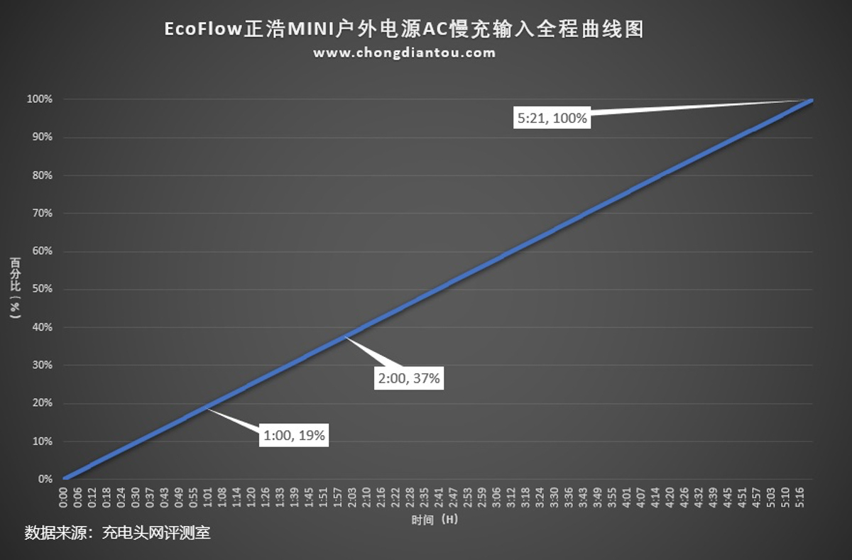 此次還采集了 德 DELTA mini 戶外電源通過AC電源線輸入的全程數據并繪制成了曲線圖,測試了 德 DELTA mini 戶外電源快充和靜音充電兩種自充電模式,上面的曲線圖是靜音充電全程,整個充電全程持續了大約5小時21分左右。