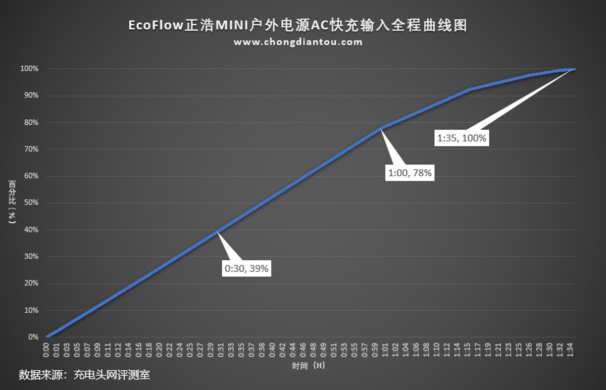 將靜音充電關閉開啟快充輸入狀態時,測得將EcoFlow正浩 德DELTA mini戶外電源充滿僅需1小時35分,短時間即可完全充滿電,滿足應急情況使用。