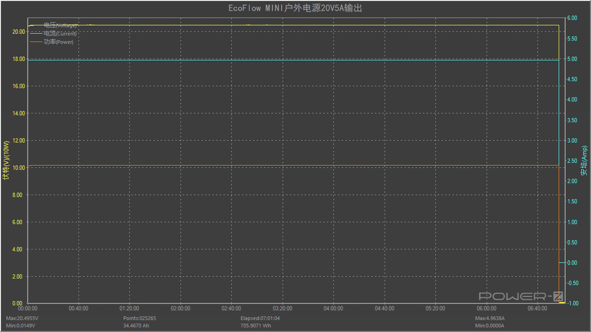 這里測試了一下 德 DELTA mini 戶外電源的USB輸出,讓 德 DELTA mini 戶外電源通過USB-C以20V5A 100W的功率持續輸出,整個過程持續了約7小時左右。