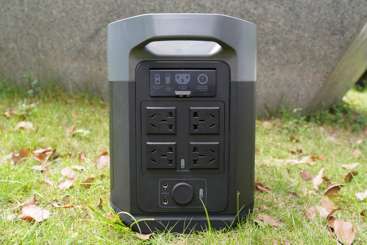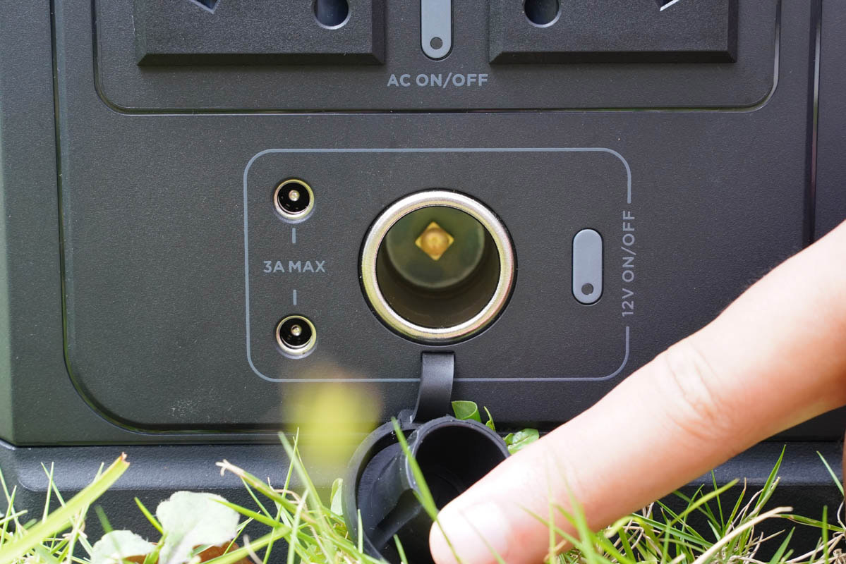 EcoFlow正浩 德 DELTA Max 戶外電源的接口全部集中在較窄的兩個側(cè)面上,先來看一邊,整體分為三個區(qū)域,中間為 220V AC 交流輸出接口,底部為車充輸出接口以及 DC 輸出接口,每種接口區(qū)域均有獨立開關(guān)控制。