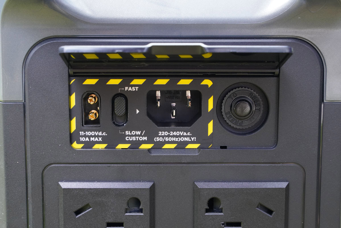 打開保護(hù)蓋,從左到右分為大電流太陽能和車充直流輸入接口;快速充電/自定義充電設(shè)置切換開關(guān);品字交流電輸入接口以及過載保護(hù)開關(guān)。