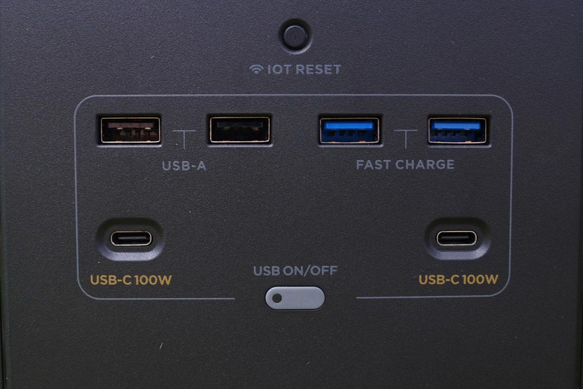 USB 接口部分,機(jī)身共配備了 4 個 USB-A 輸出接口,其中 2 個 USB-A 接口內(nèi)部為藍(lán)色內(nèi)舌,意為支持快充。除此之外還有 2 個 USB-C 輸出接口,均支持 100W PD 快速充電。