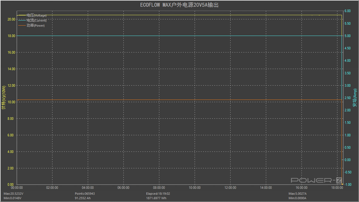 因為EcoFlow 正浩 德 DELTA Max 戶外電源配備的 USB-C 接口支持 100W 的輸出功率,所以此次小編增設(shè)了這一測試數(shù)據(jù),以 20V5A 100W 的功率持續(xù)輸出,可以看出EcoFlow 正浩 德 DELTA Max 戶外電源持續(xù)工作了 18 個小時以上,并且輸出全程非常穩(wěn)定。