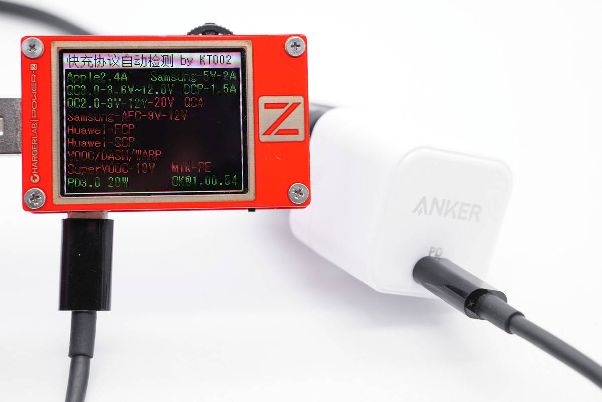 使用ChargerLAB POWER-Z KT002測得USB-C口支持Apple 2.4A、Samsung 5V2A和DCP協議,以及QC2.0、QC3.0、PD3.0快充協議。