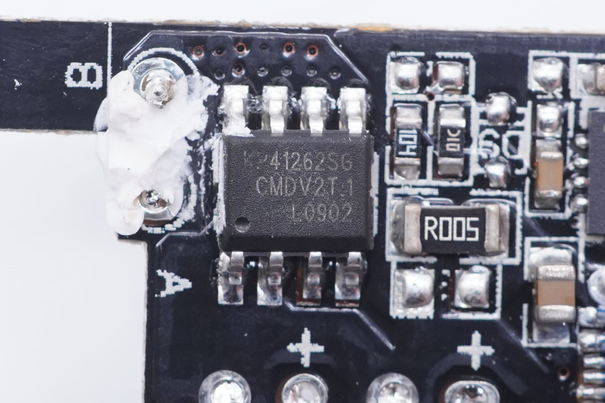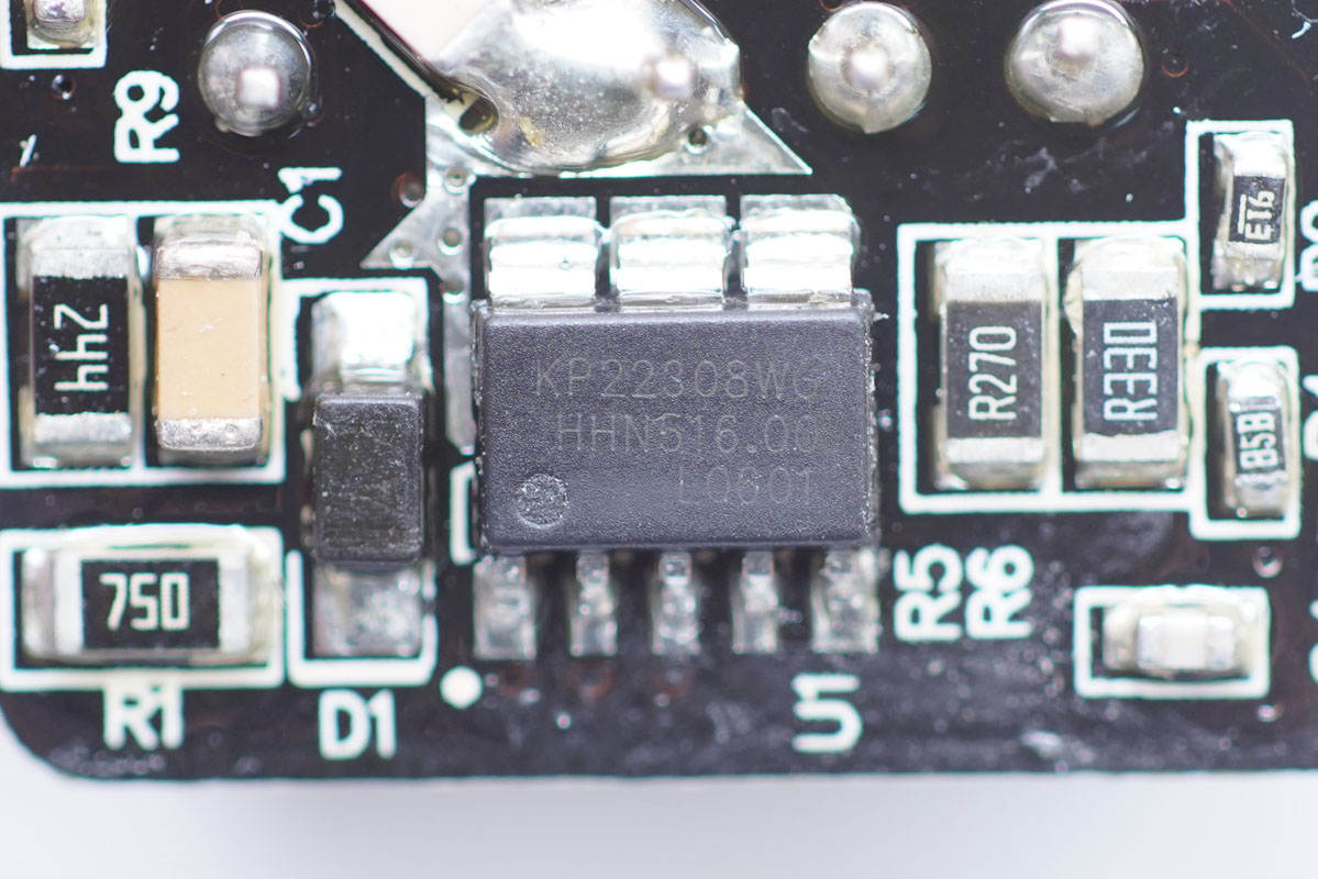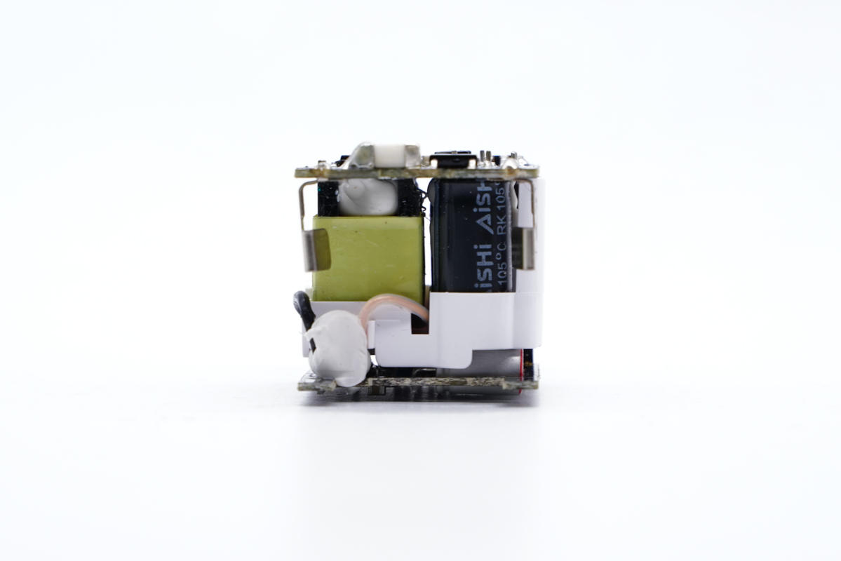 充電頭網通過拆解了解到,充電器內部采用三塊小板組合焊接設計,其中輸出端小板還鏤空處理,避免積熱。模塊間的元器件打膠加固,電容套有塑料殼隔離。充電器采用必易微KP22308WGA+KP41262高集成快充方案,智融SW2303協議芯片控制輸出電壓,這是一顆高通QC5認證芯片,性能可靠。此外采用艾華品牌電容進行濾波,整體用料不錯。