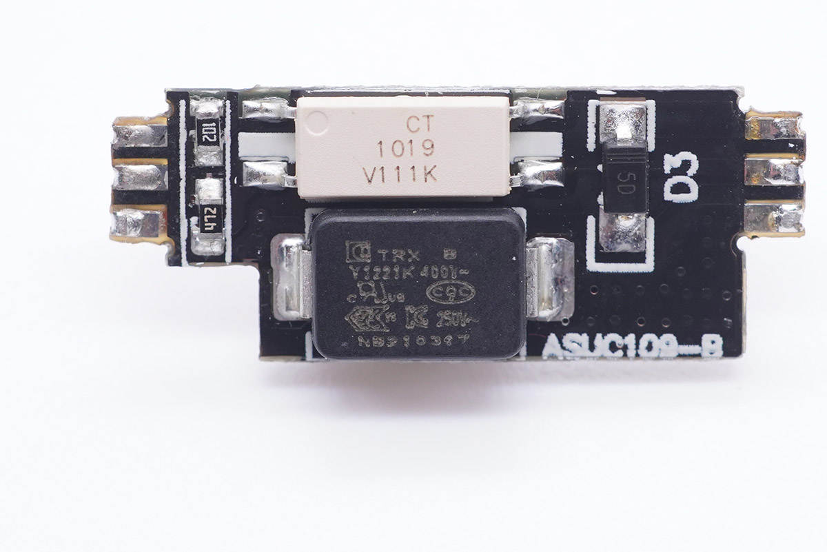 輸入端小板背面設有貼片保險絲、整流橋以及主控芯片。