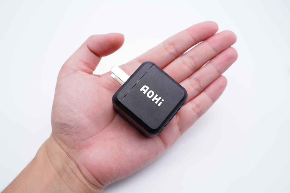 將AOHi Magcube 65W氮化鎵充電器拿在手上。