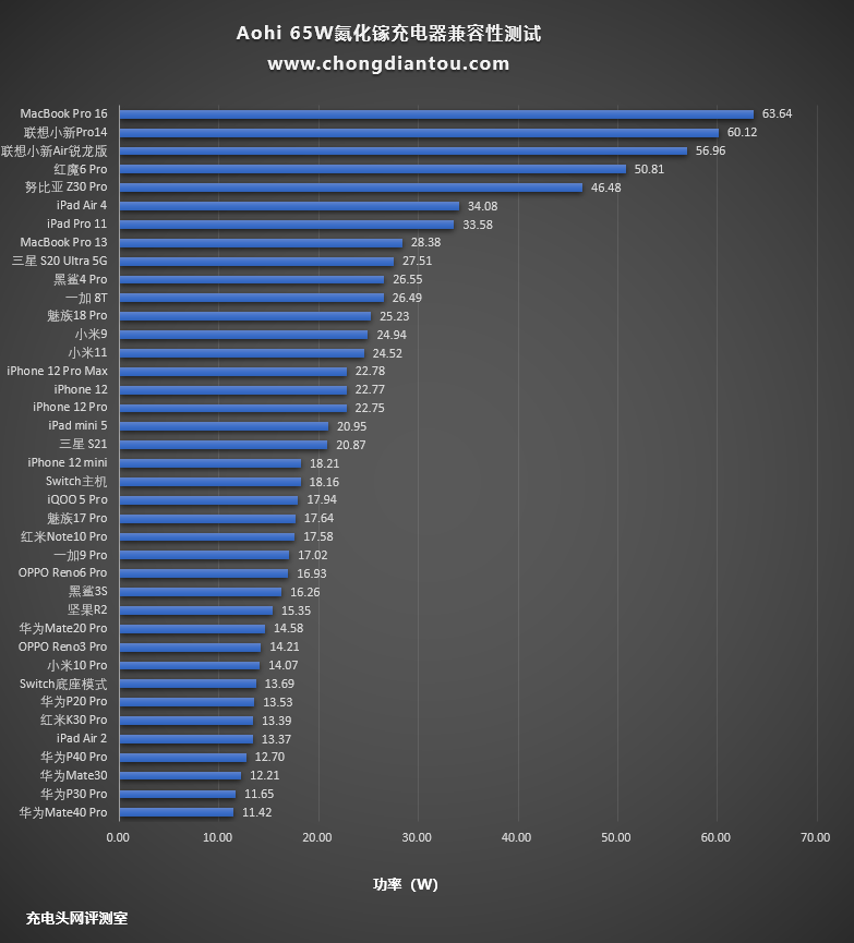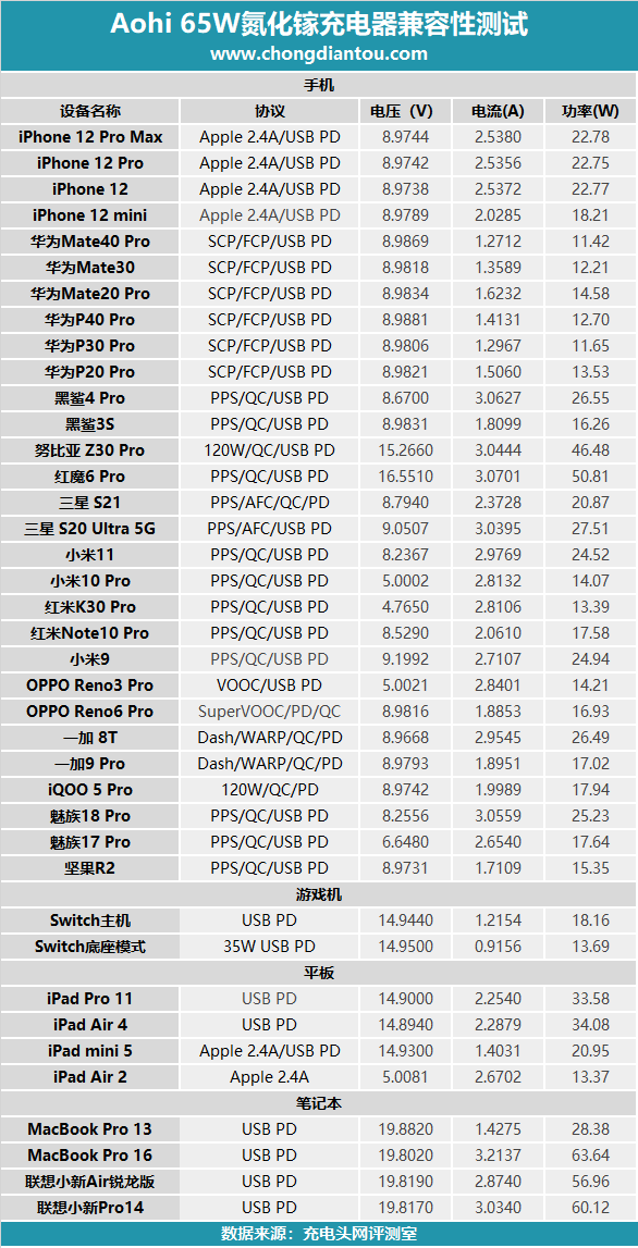 充電器支持最高65W快充,幾款筆記本電腦的功率自然最高,其他設備均處于正常的快充狀態。