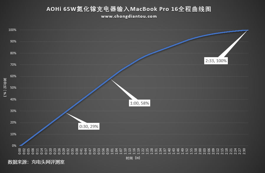 因為65W的功率已經滿足筆記本的功率需求,但為了更大程度發揮出充電器的性能,所以此次增設了為MacBook Pro 16充電全程的數據并繪制成曲線圖。從曲線圖上可以得知,充電器為MacBook Pro 16半小時充電29%,1小時充電58%,完全充滿需要2小時33分。