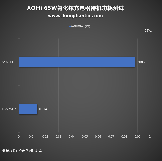 充電器如果經常插在插座上不使用也是會耗電的,只不過非常小而已。經過功率計測試,AOHi Magcube 65W氮化鎵充電器在220V 50Hz的空載功耗為0.088W,換算下來一年損耗的電能約為0.77KW·h,若市價電為0.6元/KW·h,則充電器一年的電費約為0.46元左右。