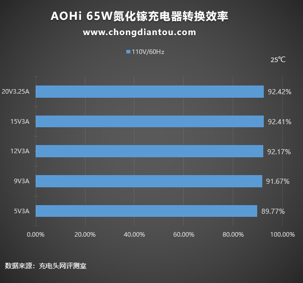 110V 60Hz下,充電器的轉換效率從89.77%到92.42%不等。
