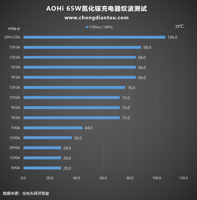 國家標準中充電器紋波要求是不高于200mVp-p,AOHi Magcube 65W氮化鎵充電器在110V 60Hz、220V 50Hz輸入電壓下,所有輸出功率紋波峰峰值均低于200mVp-p這個標準,表現不錯。