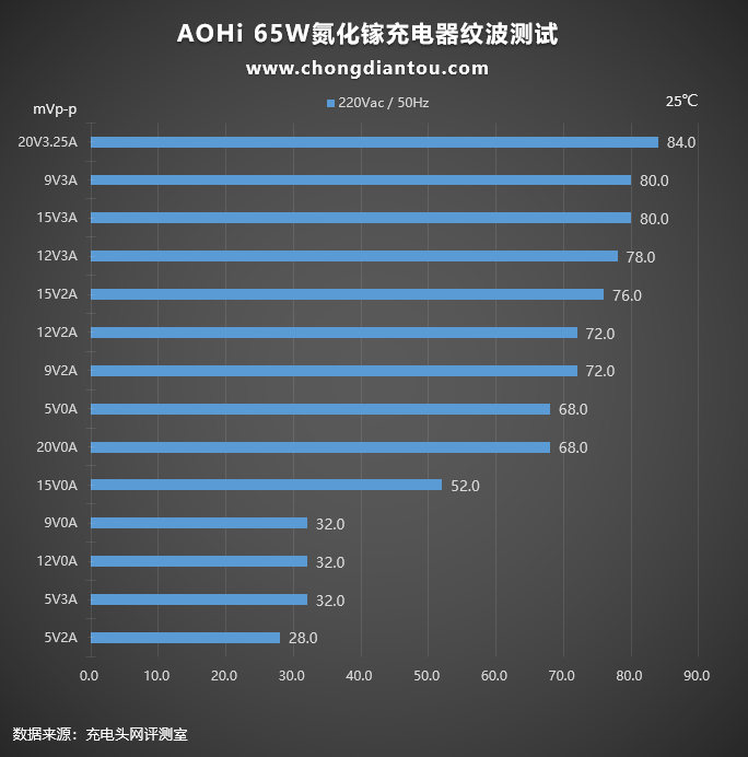 這是使用AOHi Magcube 65W氮化鎵充電器在220V 50Hz交流輸入下的紋波測試,紋波測試分為空載(柱狀圖中Y軸電流為0A)和重載(柱狀圖中Y軸電流為非0A)兩種。紋波最高為84mVp-p,充電器處于20V3.25A輸出狀態;最低為28mVp-p,充電器處于5V2A輸出狀態。