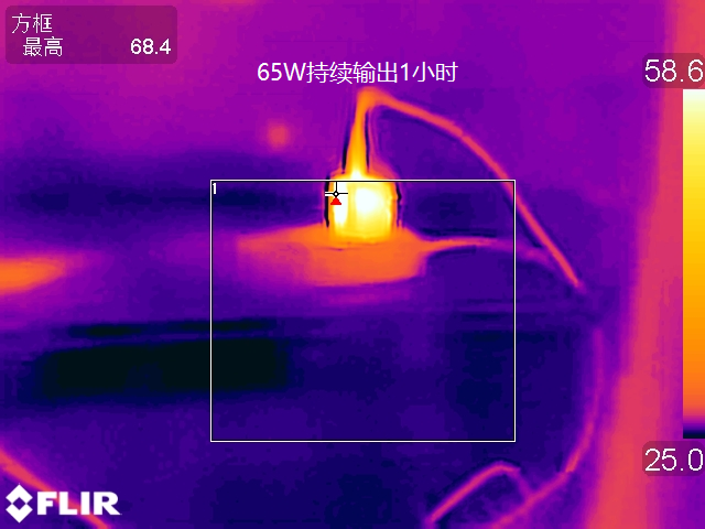 讓充電器以20V3.25A 65W的功率持續輸出1小時后采集到充電器表面的最高溫度為68.4℃。