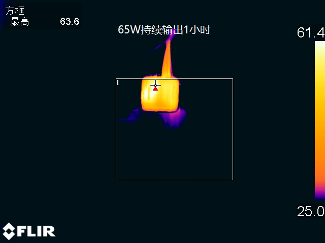 最后還對充電器的溫控方面進行了測試,測試在25℃的恒溫箱內進行,測試條件為以20V3.25A 65W的功率持續滿載輸出1小時后使用熱成像儀對充電器表面的溫度進行采集。