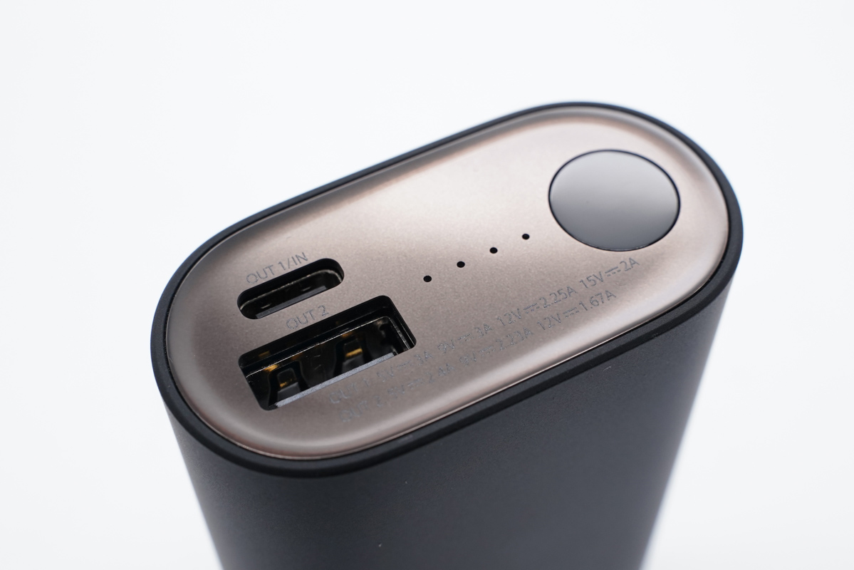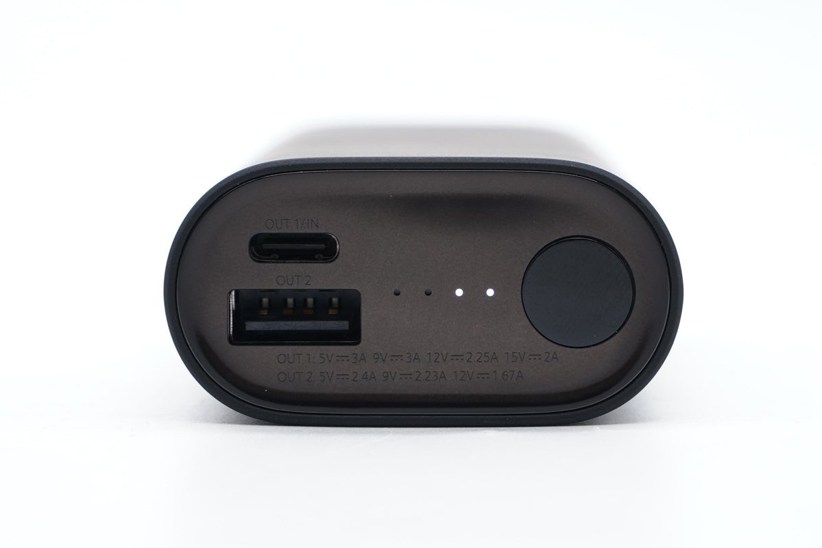 ZMI 紫米將全部的功能開(kāi)孔全部集中在了接口面板,包括 1 個(gè) USB-C 雙向快充接口,USB-A 快充輸出接口,四顆電量指示燈以及碩大的圓形電源按鍵。按鍵略微突出方便用戶盲按操作。