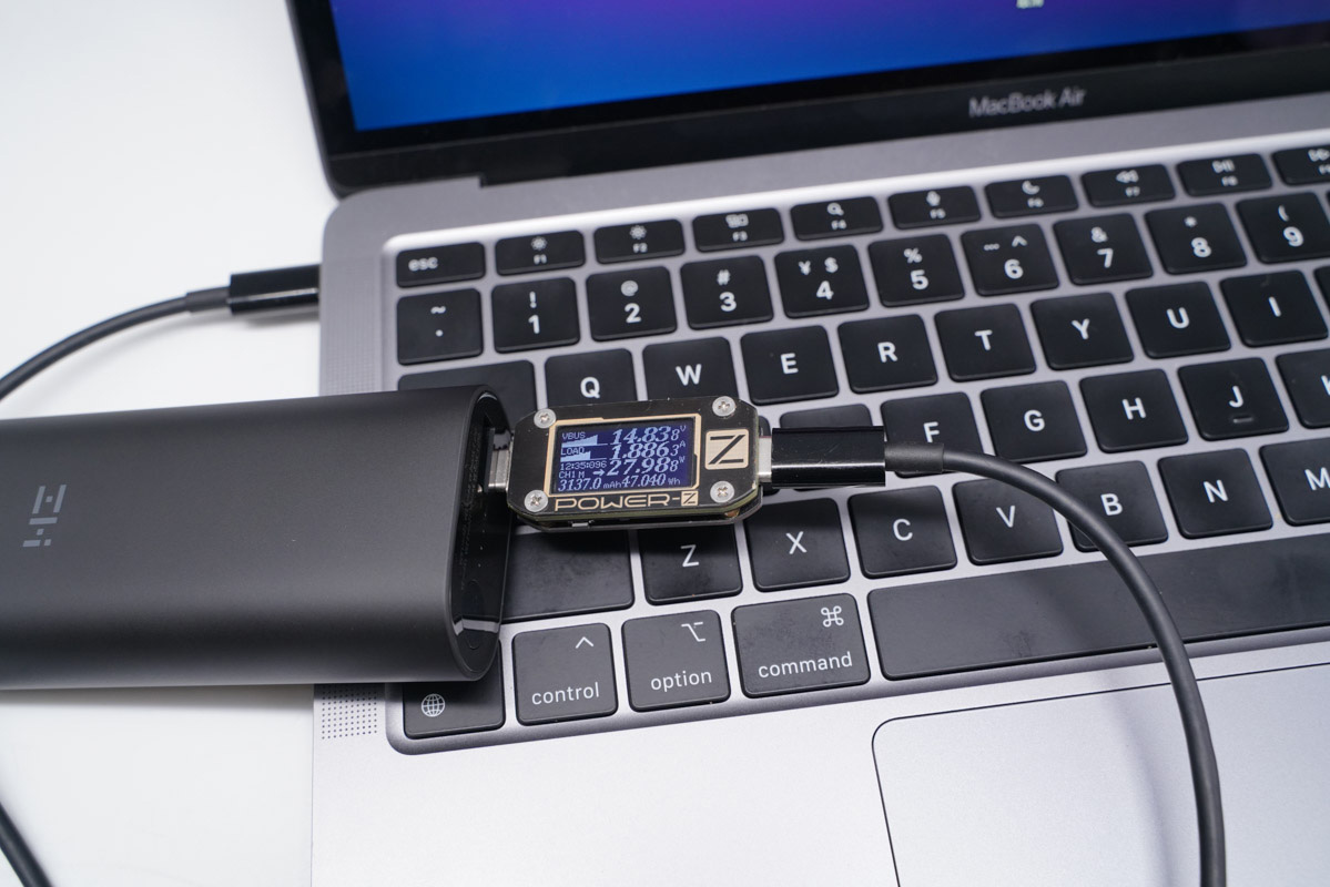 蘋(píng)果最新推出的 MacBook Air M1 配備的 USB-C 接口支持 USB4 傳輸協(xié)議,支持 USB PD 快速充電,使用USB-C 為 MacBook Air M1 充電,功率為 14.83V 1.88A 27.98W。