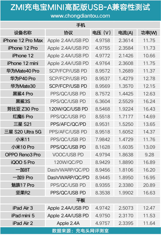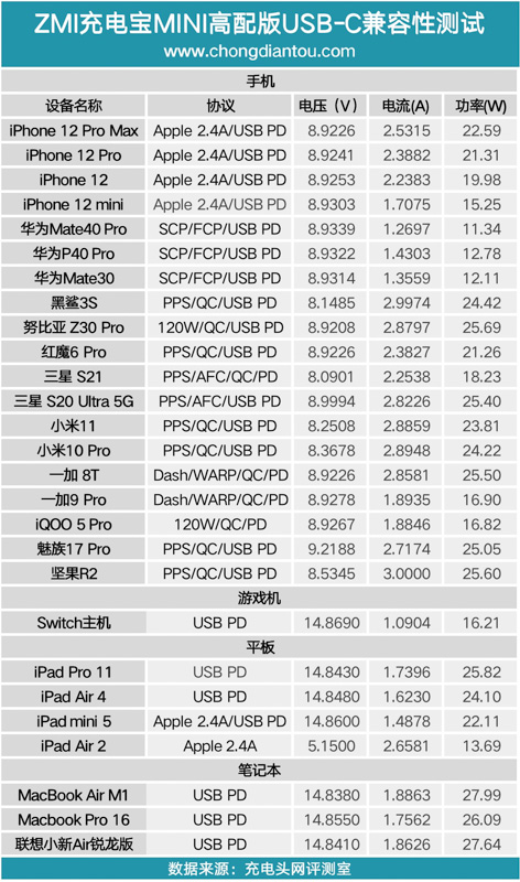 從測(cè)試的數(shù)據(jù)上看,手機(jī)這里清一色的 9V 快充,其中得益于 PPS 的加持為三星小米等機(jī)型可以提供大功率快充,整體表現(xiàn)不錯(cuò)。iPad 和筆電則可以提供 15V 的高壓快充。